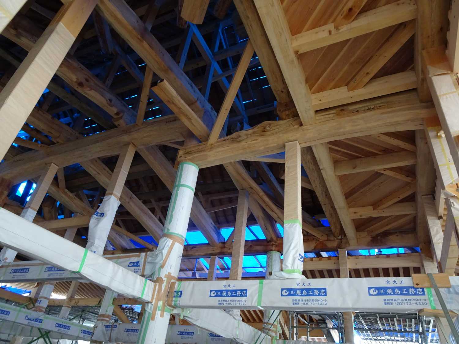 静岡市の曹洞宗 東光寺で木造本堂新築工事が進んでいます。工事は静岡県掛川市の株式会社 飛鳥工務店にお願いしています。現在現場では、大工達が軒先の切裏甲の細工を進めています。写真をご覧ください。木材検査でその太さに驚いた松の丸太も、所定の位置に納まると馴染んでしまう!それほど頑丈な骨組みです。明治、大正、昭和に建てられた本堂の調査を行うと・・・思いの他構造材が細く、耐震壁も少ないことに驚きます。それに比べ、最近設計する本堂は構造材が太いだけでなく、耐震設計も年々進化しています。写真のように、梁と桁の間に板を張っているのも、耐震力を高める大切な工夫。ただ、「菅野さんの設計は頑丈だけど、施工が難しい」と造り手からよく言われるので、菅野企画設計の特徴なのかもしれませんが・・・。【菅野企画設計】は、寺院建築・和風住宅・古民家再生を得意とする設計事務所です。≫≫ 菅野企画設計 HP≫≫ 寺院完成ギャラリー≫≫ Instagram(寺院)≫≫ Instagram(住宅)≫≫ Pinterest◆本社◆ 愛知県一宮市木曽川町黒田往還南60-3 TEL 0586-84-2003◇関東事務所◇ 横浜市中区太田町6-79アブソルート横濱馬車道ビル4階 TEL 045-264-9160