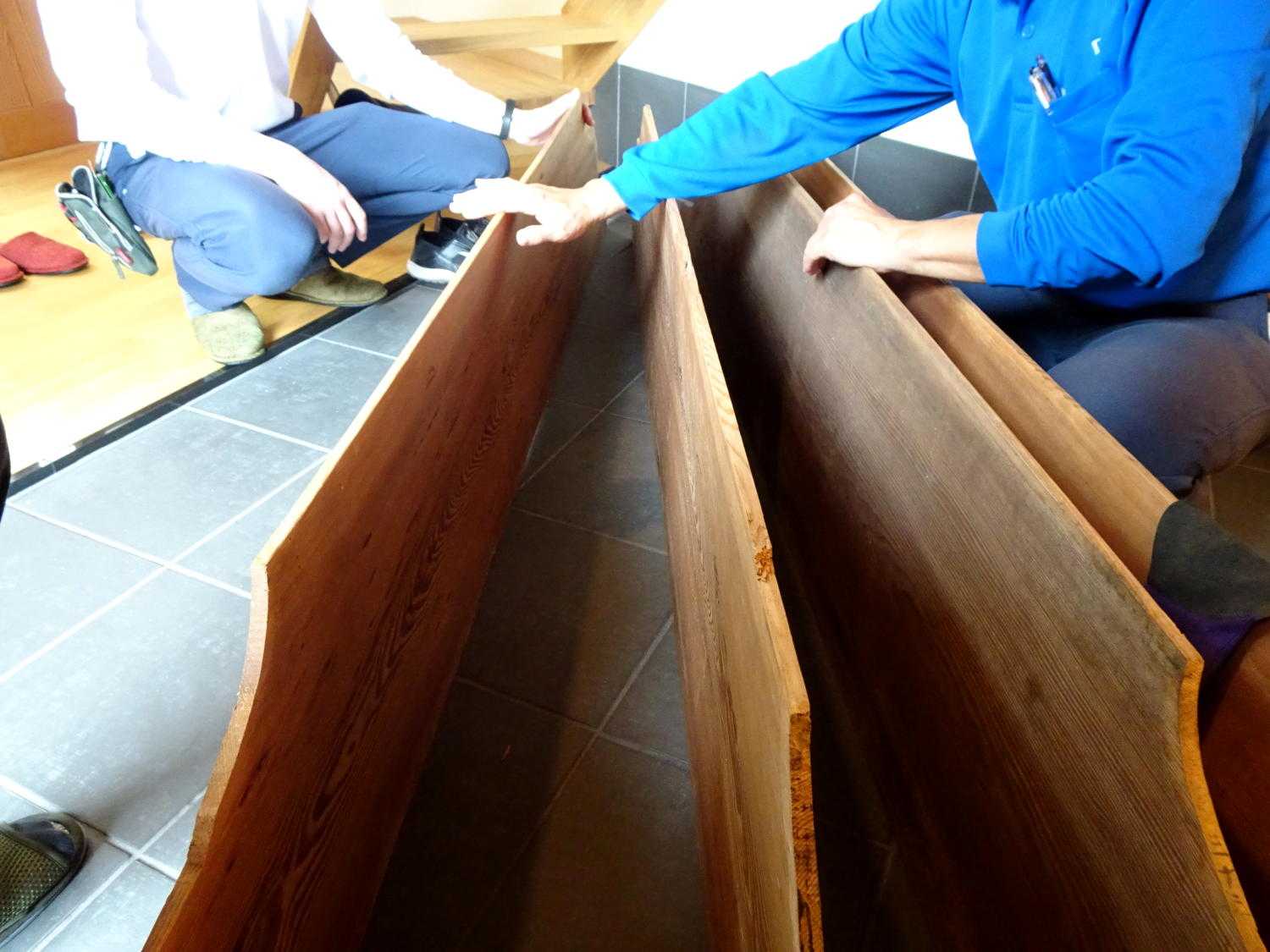 山口県岩国市の浄土真宗本願寺派 光福寺で木造本堂を造ります。工事は愛知県江南市の(株)アイチケンにお願いします。棟梁、工事監督に来社してもらい、前嶋と4人で詳細な納まりついて打ち合わせ。岩国の現場では、地元の(株)大島組が基壇のコンクリート打設を既に終え・・・本堂の木材加工もどんどん進んでいるので、待ったなしです。「再利用する予定の琵琶板が反っているんですが・・・どうしましょう。今日持ってきましたので、見てもらえますか?」と監督。本社事務所と建設会社が近いと、こういう時、便利です。板は4枚、指金を当ててみると・・・中央で9ミリ程度反っている板もあります。「かなり反っているね。でも、杢目はきれいだし、旧本堂の材を再利用することにも意味がある。加工が難しいかもしれないけど、頑張ってよ」「了解しました」と棟梁。【菅野企画設計】は、寺院建築・和風住宅・古民家再生を得意とする設計事務所です。≫≫ 菅野企画設計 HP≫≫ 寺院完成ギャラリー≫≫ Instagram(寺院)≫≫ Instagram(住宅)≫≫ Pinterest◆本社◆ 愛知県一宮市木曽川町黒田往還南60-3 TEL 0586-84-2003◇関東事務所◇ 横浜市中区太田町6-79アブソルート横濱馬車道ビル4階 TEL 045-264-9160