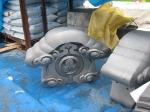 「瓦を下ろしてみたら、結構痛んでいて、割れや欠けがあってねえ・・・それに燻しがとれて、黒く変色しているんで新しい瓦と色が合わないんですよ。鬼瓦を焼き直してみたんで見てください」は瓦屋さん。