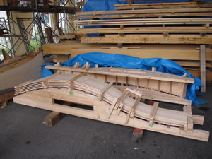 軒裏にはその曲線に沿う垂木を配し、その上に桧の板を張ります。垂木と直角方向に張れば問題はないのですが、垂木方向に張ろうと思うと、板も湾曲している必要があります。
