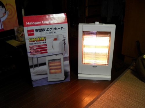 朝夕はめっきり涼しくなってきたというより、少し寒く感じるようになってきました夜、ソファーに寝転がってテレビを見ているときなど、寒さを感じることが多いです。我が家はこたつをする習慣がなく、ホットカーペットに石油ファンヒーターで冬を過ごすのですが、いくらなんでもまだファンヒーターを出すには早すぎます。こんな時期は、いつも電気ストーブを使っていたのですが、調子が悪くて困っていました。なので、妻がハロゲンヒーターを買ってきました。なんと言っても、素晴らしいのはスイッチオンすると、わずか2秒で写真のように一気に暖かくなります朝、起きたときは重宝すると思います。それと首振り機能もあります。いいですねえ~。これが5,000円でお釣りがくるのですから。気持ちまで暖かくなりました。