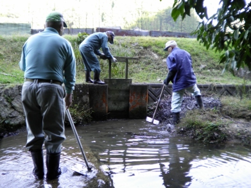 私の住んでいる地域では、県からの補助金をいただいて、農地・水・環境事業というのをやってます。これは、多くの自治会で高齢化が進み、村の住環境が荒れ放題になっているところが多いので、それぞれの自治会の人たちが協力して、農地や用水路の整備や清掃をして、住みやすい村をつくろう、とするものです今日は、2か月ぶりの作業でした。まず、川から用水路に水が流れ込むところにある「板の堰」を新調しました。写真にあるように上へ引き上げたり、降ろしたりして水を水路に流したり止めたりするものです。見えているのは古い「板の堰」です。長老によると20年くらい経っているとのことでした。この板が腐ってしまったので、量販店から板や防腐剤を買ってきて製作しました。製作道具は村の人たちの持ち寄りです。防腐剤を塗って完成しました。これは乾かしているところです。次に、水漏れしている用水路の補修をしました。速乾コンクリートを買ってきて、少し硬めに練って水が漏れているところに詰めました。修復後の写真です。これで2,3日乾かせばいいと思います。女性陣は、と言っても、今日は2人の参加でしたが、道端に不法投棄されているごみを拾って集めています。そんなこんなで、8時から12時前まで約4時間の作業でした。これからも鳥獣対策のネット補修などすることはいろいろあるので、80歳を超える高齢者がほとんどの村ですが、協力し合って環境整備をしていこうと思っています