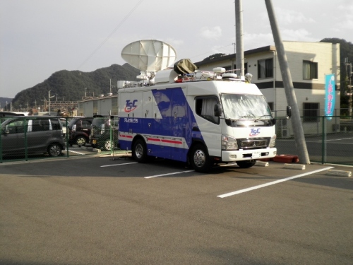 わが町には、山陽本線、JR上郡駅があり、その駅前に「観光案内所」があります。今日の夕方、テレビせとうちの「TCS news5」というニュース番組の中で、生中継により観光案内所が紹介されました。中継車もやってきました。17時13分からの番組で紹介されるのは17時30分から約8分間の予定。それでも、14時ごろには中継車とともに、アナウンサーやディレクター、カメラマンなど中継スタッフが7人来られました。念入りに打ち合わせの後、本番の動きの確認などを行いました。いよいよ本番です。アナウンサーによる取材を案内所スタッフが受けました。その後は、観光案内所のなかの紹介です。わが町の公式マスコットキャラクターも登場して、盛り上げてくれました。左が「円心くん」、右が「エイトちゃん」と言います。取材も受けました。テレビせとうちさんは、岡山県、香川県が放送エリアなのですが、兵庫県のわが町は岡山県と隣接しており、先日出向いて、わが町の紹介をお願いしたところ、報道制作局長さんが快く了解していただきました。感謝です!少しでもわが町に観光客に来ていただき、にぎやかになればと願っています。