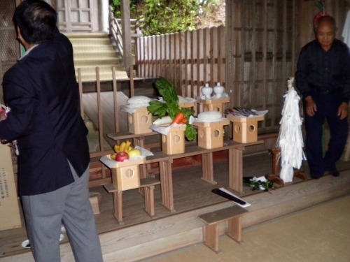 台風19号が近づく中、村の秋祭りの神事が行われました。村の神社、須賀神社といいます。神主さんが来て、お餅や米、するめ、野菜、果物などをお供えします。ちゃんとお供え物の順番とか位置がきまっているみたいです。村の人たちも集まってきました。と言っても、世帯主の人たちで15人ほどですが・・・・・神主さんが祝詞を読み上げてくれました。その後は、みんなで食事をしながら、村の将来などについて話し合いました。30代、40代の人が若い世代で、ほとんどが80代の高齢者層になっているわが村は、完全に限界集落化しており、あと何年、自治会の運営ができるか心配ですみんな元気で長生きしてほしいと願ってます!