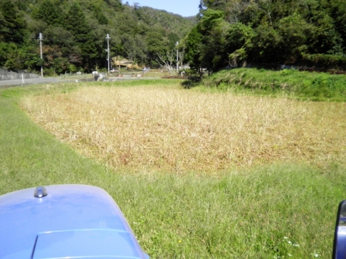 ご近所さんから管理をお願いされている田んぼ?というか、畑?というか、雑種地?というか、そんな荒地があります。多分、登記簿上の地目は「田」だと思うのですが・・・カヤとか何かわからない植物が群生していますこんな感じです。でも、これが案外役に立つのですこれを刈り取って、腐熟させて、畑の土づくりなどに使います。そこで、草刈り機で刈り取って、軽トラで畑まで運びます。軽トラに積みやすいように、何か所かに分けて集めます。これを畑まで運んで、来年の春まで風雨にさらします。すると、いい具合に腐熟し土に鋤きこむと有機肥料となるし、移植した野菜の苗の横に敷くことによって、保温にもなるし、保護します。おいしい野菜が収穫できます
