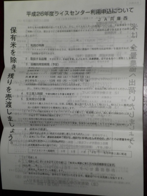 JAの営農生活センターから、26年度のライスセンターの利用申込書の様式が郵送されてきました。昨年、一昨年とライスセンターを利用した農家さんに郵送する旨のことが書いてありました。これです。ライスセンターでは、搬入されたモミの量を計り、乾燥してもみすりをします。そして、全量をJAに売り渡すのか、個人の保有米を除いて売り渡すのか、などをこの利用申込書に書いて提出します。扱う品種と荷受け期間は、キヌヒカリ 9月12日(金)~9月28日(日)きぬむすめ 10月1日(水)~10月12日(日)ヒノヒカリ 10月13日(月)~10月30日(木)兵庫夢錦 10月4日(土)~10月11日(土)はりまもち 10月6日(月)~10月17日(金)と書いてありました。キヌヒカリはいちばん早いので、9月中旬の連休に刈り取り、ライスセンターに搬入しようと考えています。それにしても、強い勢力で、ゆっくり北上している台風11号の襲来が心配ですここまできて倒伏したら、後の作業効率や収穫量に大きな影響が出てしまいます。
