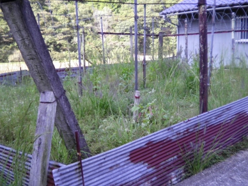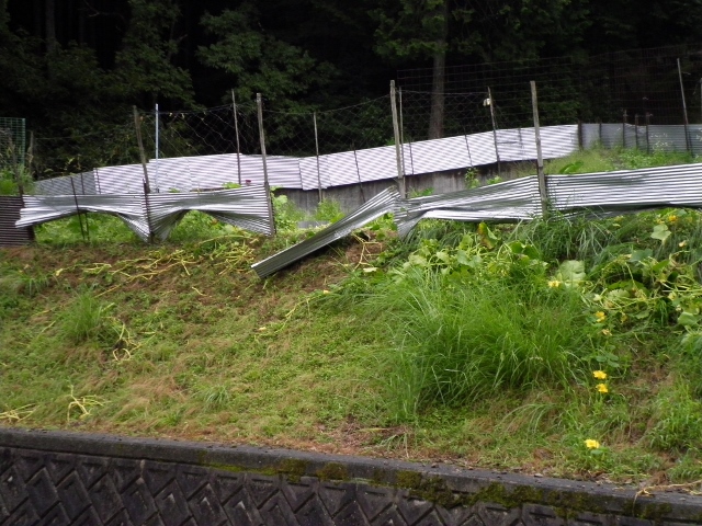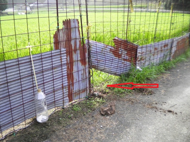 水稲の穂揃期の今、そろそろ猪の出没に注意しなければなりません去年も今の時期に、子供の猪(この辺ではウリ坊と呼んでます)が、田の中に住処を作り、結局、刈り取りまで住み続けました。その結果、稲を踏みつけて倒してしまうわ、穂を食べるわ、散々な目にあいましたそんな中、私の住んでいる集落で、今年最初の猪被害がありました。ご近所さんの畑です。トタン板で囲っておられたのですが、写真のように猪が鼻先で持ち上げ、畑に侵入したらしいのです。スイカ、サツマイモなど、全部食べられてしまったそうです。拡大するとこんな感じです。何か所も、トタン板を破壊して侵入しています。畑の持ち主の老夫婦の怒りと落胆は、見ていてもつらかったです
