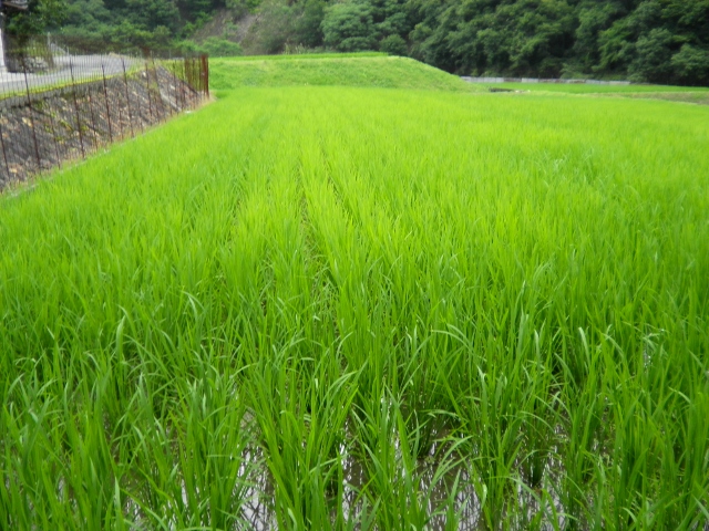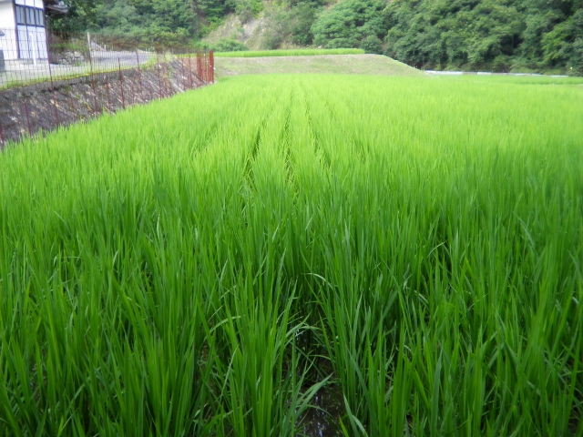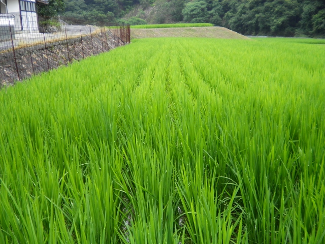 田植え後6週となりました。 家の下の様子です。条間もわからなくなってきました。 茎長も40cmを超え、竹が見えなくなりました。 今日の午後、調整肥料のPK28(ケイ酸加里)を散布する計画でしたが、雨が降ってきたのでできませんでした。 この肥料は、次のように使用します。調整肥料中干し前に施用 追肥として 20~40kg(10a当たり)適宜増減する成分は、りん酸2.4kg、加里3.6kg、苦土0.8kg(1袋当たり)く溶性りん酸12%うち水溶性りん酸2%く溶性加里18%うち水溶性加里12%く溶性苦土4%・窒素を含まず、りん酸、加里の必要な時期に施用・緩効性のケイ酸加里を含んでいるので加里の流亡を防ぎ、後期まで肥効が期待できる とのことですが、JAによると、土づくりができており、分けつ過多などの心配がない場合は省略できるとのこと。 間もなく、中干しする予定なので、今年は施用しないつもりです。