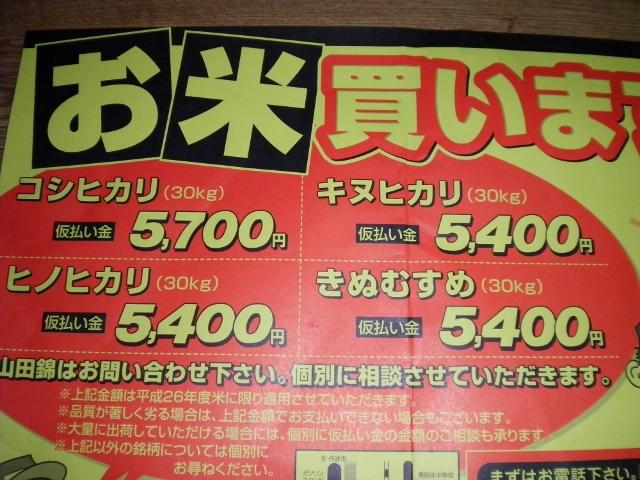 新聞の折込に、近くのまちのお米屋さんの広告が入っていました。26年産米限定で、コシヒカリだけ5,700円/30kg、その他のキヌヒカリ、キヌムスメ、ヒノヒカリはどれも5,400円/30kgで買い取ります、とのことでした。まだ、JAの買い取り価格の広告が入っていないので、何とも言えませんが・・・・・この価格、高いのか、安いのか・・・・・今年は、お盆以降の天候不順で、一等米の割合が少ないのではという話は聞きましたが。