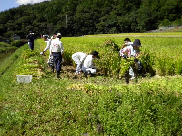 以前にも紹介しましたが、私の自治会では、5年ほど前から県の「小規模集落元気作戦」という事業で支援をいただいて、都会の人たちと米作り、野菜作りを通じて交流を図っています。先日、この人たちのオーナー田で、5月下旬に田植えしたキヌヒカリの稲刈りをしました。まず、コンバインが刈りやすいように四隅を鎌で刈り取ります。その後、コンバインで刈り取りします。5条刈りの大型コンバインは、地域の人が貸してくれます。コンバインのタンクが刈り取ったモミでいっぱいになったら、軽トラに移します。この軽トラでモミを運搬し、乾燥機に入れます。こうして乾燥が終わったら、もみすりをして玄米になります。オーナーの方はこの様子をご覧になって、大変喜んでおられました。やっぱり自分たちで田植えし、刈り取ったお米を食べられることは、安心して食べることができる、とおっしゃっていました。10月下旬には、また、収穫祭を開きます。この時には、餅つきをしたり、新米で作ったおにぎりをおなか一杯食べます。この様子は、また紹介します。