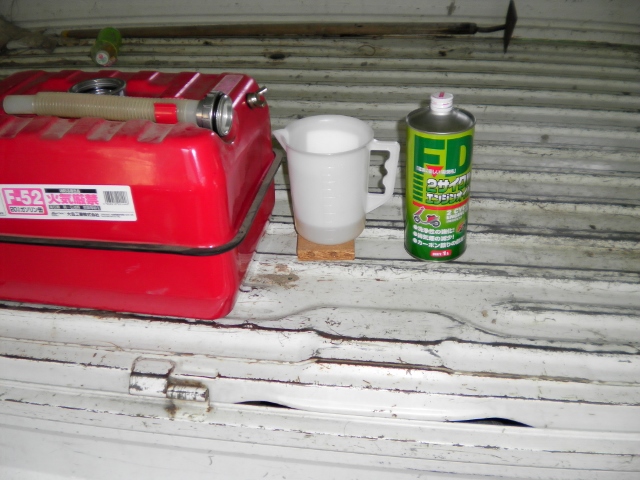 我が家には、混合ガソリンを燃料にして動く農作業機械が4台あります。刈り払い機が2台、自走式斜面草刈り機が1台、動力噴霧器が1台です。1年に大体20Lくらい使うので、シーズンの初めにスタンドで購入するのですが、使い切るまでに約1年かかります。購入してからあまり長く経過すると品質が低下すると聞きました。そこで10Lの混合ガソリンを自分でつくることにしました。ナフコで1L入りの2サイクルエンジンオイル(FD級)とオイル量を図る容器を買ってきました。それぞれの機械の取説を見ると、自走式斜面草刈り機のみ1:50の割合で、その他3台は1:25の割合です。でも、以前に車屋さんに勤めていた知人によると、すべて1:50の割合で給油してもOKとのことでした。(でもマネしないで下さい。)1:25だと青い煙が出るし、プラグもべとべとに汚れやすいとのことでした。まず、一番右側が2サイクルエンジンオイルで、これを真ん中の白い容器で200ml(cc)のオイル量を計ります。これを左の赤い携行缶に入れます。この携行缶をガソリンスタンドへ持っていき、10L入れます。これで、1:50の混合ガソリンが出来上がります。軽トラに積んで、スタンドから家に帰るまでの間にオイルとガソリンがよく混じり合うと思います。今までスタンドで買うとき、割合を指定したことなかったのですが、青い煙を吐いたり、プラグがべとつくようなことはなかったので、おそらく1:50の混合ガソリンだったのだろうと思います。