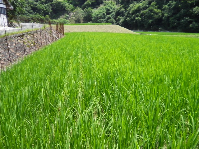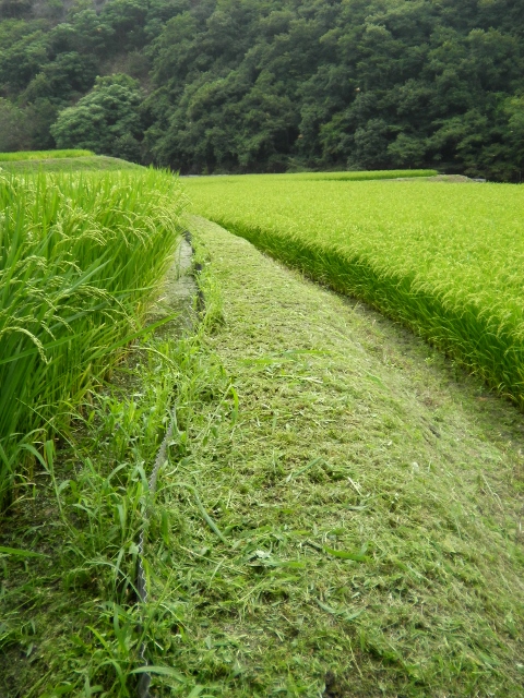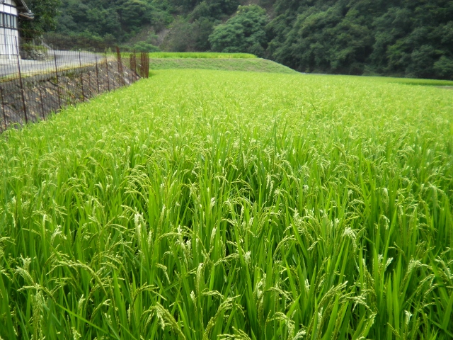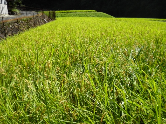 田植え後、15週目となり刈り取りまで1週間となりました。昨日は夕方から大雨が降ったのですが、今日は朝からいい天気。暑い!暑い!1週間前の田んぼの状況です。家の下です。穂はこんな感じです。昨日の大雨で、水がたまってしまいました。あと1週間、いい天気が続けば水もなくなると思います。西の田んぼです。刈り取りに備えて、あぜの草刈をしました。大久保の田んぼです。地区の農会長に聞いたら、どの田んぼもよくできている、とのことでしたあと1週間、イノシシ被害などに遭いませんように・・・・・
