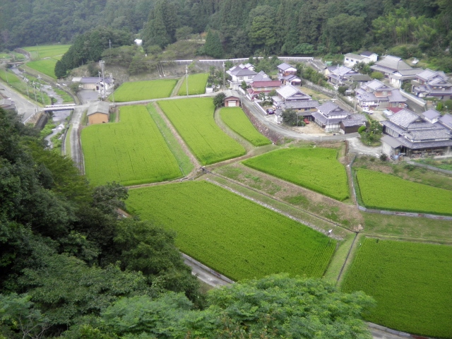私の住んでいる集落です。夏の風景です。超早熟米のキヌヒカリが青々と生育しています。もう1ケ月もすると、この田んぼが黄金色に変わり、稲刈りが始まります。少し前に、桜の咲いている風景を紹介したと思ったのですが、早いもので暦の上ではもう秋です。