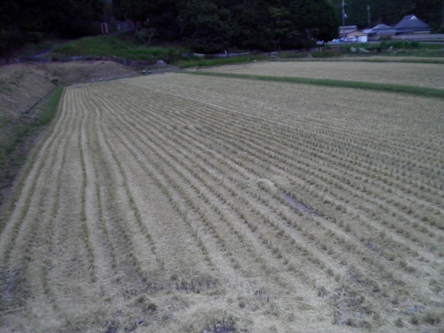 稲刈りが終わった夕暮れの田んぼです。稲刈り前の黄金色の稲穂が実った田んぼと違ってなんかもの悲しく感じます。西です。刈り取り1週間前の西。大久保の周辺です。刈り取り1週間前の大久保。田植えから16週間、雨や暑さ、風などに耐えて、稲を育ててくれた田んぼです。これからは、来年の米作りに向けて、再び息を吹き込んでやらなければなりません。