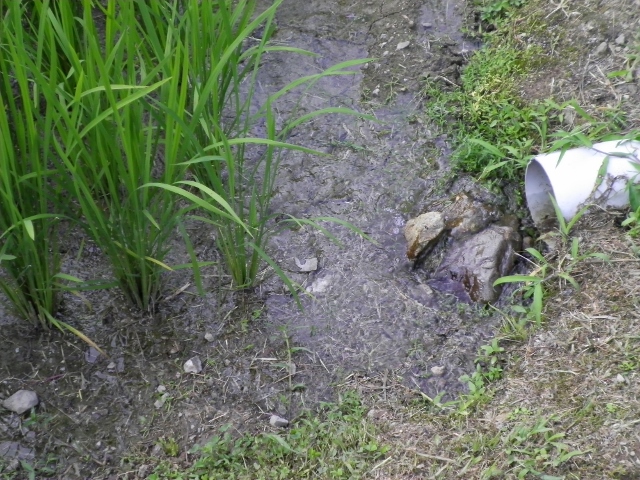 中干しを終了しました。 田んぼから落水したのが、今月7日だったので、2週間もたったので、少し長すぎると思ったけれど、最初の数日間は 雨が降って干せませんでした。 なので、実質は10日間ほどの期間、中干ししたことになります。 入水の様子です。大久保の田んぼです。 中干し直後は浅水にしないと、せっかく張った根が窒息してしますそうです。 この後は、8月上旬の出穂時期まで間断かん水を続け、そのあと登熟期には深水管理にする予定です。 西の田んぼですが、色むらのあるところに穂肥をしようと思っています。