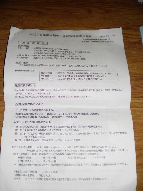 昨日、帰宅後、田んぼの水を落として中干しを開始しました。 今日、出席できなかったのですが、JAの営農生活センターの職員による「平成26年度水稲中・後期管理説明会」なるものが集落の公民館で開かれました。 こんな資料が配られました。 それによると、 現在までの生育の概況は、 5月中旬植えはやや低温であったが、天候に恵まれ順調に生育している。分げつもとれている。 とのことでした。 中干しの判断としては、 60株/坪植え・・・16本~18本/株 45株/坪植え以上・・・18本~20本/株 37株/坪植え・・・22本~25本/株 以上の茎数が確保できたら中干しを実施。とありました。 で、今後の管理のポイントとして、 ・中干し 目的:1新根の発生 2無効分げつと下位節間伸長を抑制 3収穫時の作業性を向上 時期:1株平均20本程度の分けつを確認したら中干し開始 程度:歩いて沈まない程度の固さがよい。白く乾いたり、大きな割れ目ができるようでは、干しすぎで断根などの害が心配となる 期間:土壌条件や水利、天候を考慮しながら、5日~10日程度 また、 ・中干し後の水管理として、 中干し直後は水をあて、1~3日で自然に落水する「間断かん水」を行うこと。中干し後にいきなりたっぷりと湛水すると、せっかく伸びた新根が酸欠状態になり、窒息してしまう。 とありました。 さらに、 田植えの遅れや低気温のため、茎数が確保できないときは、中干しをせず、「間断かん水」を行うこと。 とありました。 以降は、 ・穂ばらみ期~穂揃期 しっかりと湛水 ・穂揃期~登熟期 間断かん水 ・落水 コンバイン作業に支障が出ない程度まで遅らせる。米の品質低下を抑制する。 とのことでした。 まあ、このとおりにはいきませんが・・・・・ 明日以降、病害虫の発生状況や穂肥のことも書いてみたいと思います。