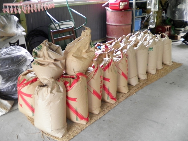 3連休を利用して、稲刈りをしました 大久保(13.8a)、西(9.5a)、家の下(3.7a)の3枚の田んぼです。合計27.0a(2反7畝)です。一般的には豊作で(10俵=600kg=30kg/袋×20袋←10a当り)の出来高とされています。 豊作なら、これだけの収穫があることになります。・大久保(13.8a) 828kg(27袋/30kg)・西(9.5a) 570kg(19袋/30kg)・家の下(3.7a) 222kg(7袋/30kg) 合計で 1,620kg、53袋になり、これだけの収穫量があれば万々歳ということになります。で、西と家の下は自家消費米と知り合いに分けてあげる分なので、ご近所さんにお願いして、もみすりをしていただいています。さっそく、していただき、今日もってきてくれました。西と家の下、合わせて20袋(600kg)でした。この2枚の田んぼの豊作の時の収穫量は、上で書いたとおり792kg(26袋/30kg)の計算になります。なので、(600kg÷792kg)×100=75.75% の出来となります。10a(1反)当り7.5俵の収穫量となりました。石(こく)換算すると3石の出来です。今年はイノシシ被害もないし、台風などによる倒伏もなく、9月に入ってからは晴天が続いたのですが、8月の日照不足が影響したのか、思っていたより少なかったですでも、サラリーマン農業としてはこんなもんかなと思っていますあと、大久保の田んぼは、JAのライスセンターに出したので、結果がわかるのが11月初めになると思います。