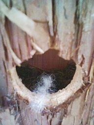 この場所で使うのかぁ。今日は私、一人で来ました。ワイルドストロベリーを植える場所をせっせと耕していたら(山は時間かかるのよ)ツリーハウスの方で2羽くらいの鳥があんまり騒ぐのでさすがに気になってそしたら巣箱から鳥が飛び立っていきました。もしかして使ってる!?しかもツリーハウスにつけたやつ・・・もっと離れたのがあるのに・・・。じゃあ、さっきの騒ぎは夫婦喧嘩?「人がいるじゃないのよっ!」「気に入ってたのおまえだろうっ!」てなもんか。見たら、巣の入り口になにかの毛と 中にふかふかの苔が敷き詰めてありました。ごめん。たまーに人が来るけど なんにもしないから 慣れてください・・・。次 いつ来れるか分からないから かまわず続きやってください・・・。こっちは警戒して使わないかな~と思ったんだけどね(つけといてなんだけど)。でもハウスから離れた所の巣箱(外壁は焼き杉)は使われた気配なしで。焼き杉より檜皮の方が好みなのかしら。それとも高さか ツリーハウスの方がだんぜん高い所につけられるので。前に、あかねずみの夫婦の邪魔もしたからな(July 9, 2007の日記)。せっかくだからそのまま使って欲しい。モモンガ Welcome! で入り口が少し大きめだから、来ていた鳥もちょっと大きかった。逆光で羽の色とかよく見えなかった。なんていう鳥かな。