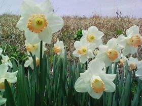 この里山の春はすごい。どの家も広い敷地でどっかんどっかん花を咲かせる。「すごいですねー」て声をかけるとたいてい「なんもせんでも よーふえるわ」て返ってくる。それでもたとえば水仙は球根で、ほんとになんもせんかったら3年もすれば葉っぱばかりになるからきっと毎年少しずつ古くなった株の球根を掘り出して分けて 新しいのを植えて、てのを何年も続けているのでしょうどの花もそんなふうに人が手伝うから咲きすぎるほど咲いて路肩にも空き地にもこぼれています。次は 里中 マーガレットが咲きまくる。舞い散る桜の下でもう準備できてるからすごいよ。