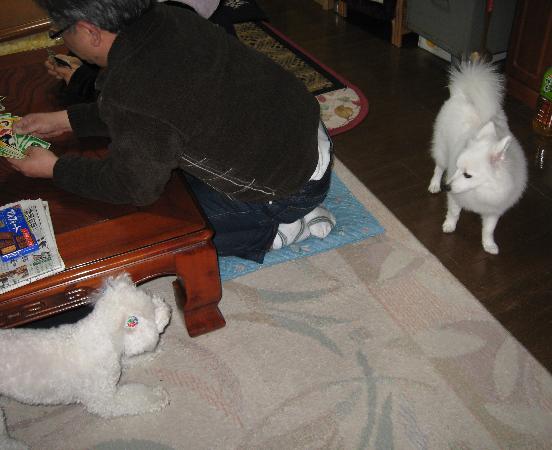 明けましておめでとうございます。本年も宜しくお願いします。我が家は今年も義弟一家がやってきて、年越ししました。そして今年は、昨年以上ににぎやかな年越し。それは、犬!義弟の家では、昨年の春先にトイプーとシーズーのミックス犬を飼い始めたそうで、うちのバニラとは初対面。どちらも興奮してしまい、大騒ぎでした。一晩明けて、今日はちょっと落ち着いたんですが、まだまだ一触即発状態です。今はお酒を飲んだお父さん達と一緒に犬もお昼寝中ですが、そろそろおき始めた模様。母は再び晩御飯の支度に行かねば。こんなドタバタな一年の始まりですが、今年もみんな健康で楽しく過せればいいなあと思っています。本年も宜しくお願いします!