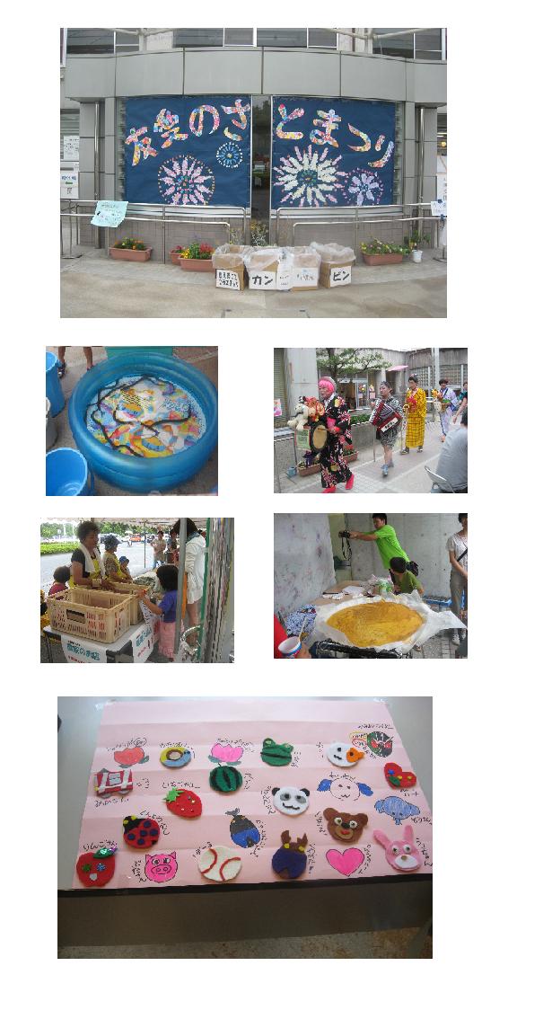 今日は私が時々ボランティアにいっている友愛のさとまつりでした。ここは発達支援センターで、病気を持つ子供達に対して、様々なサポートをする施設です。私はここで使われる道具や遊具の制作や修理のお手伝いをしているので、実際の利用者さんに触れ合えるのは今日だけ。とても貴重な経験でした。今日、失敗したなあと思ったのは、開場前に様子を見に来た子に「いいのは早い順になくなるよ」と言ったら、その子はこの場所から離れられなくなってしまって。他の所に行かなければならないご両親が一生懸命説得していて、申し訳ない思いでいっぱいでした。まあ、色々と失敗はあったものの、天候が悪かった割りにはお客さんも盛況だったようです。出し物もいろいろあって、うなぎすくい、すいか割、ぐりぐらのホットケーキなどのほか、ちんどんやさんや、ブラスバンドの演奏、お芝居や講演会など、盛りだくさんでした。私はフェルトで作るワッペンのコーナーを担当したんですが、お客さんが途切れずに来てくれて、あまり他の出店を見て回れなかったのが残念でした。お客さんがうれしそうにしている姿は、スタッフとしても楽しいものでした。また来年もお手伝いできるといいな。