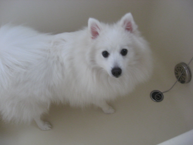 クンクン、この匂いは・・・。お風呂だあ。顔にお水がかかるのが嫌なんだよね。優しく洗ってよ。お湯で流すのはいいんだけど、ちょっと熱いよ。もうちょっと水圧、下げてよ。逃げ回ったけど、おとうさんに捕まっちゃった。ああ、嫌だなあ。ドライヤーの音、キライ!!うるさいんだもん。はああ、ようやく終わった。私、きれいになった?明日、お友達に会うんだって。楽しみ!!