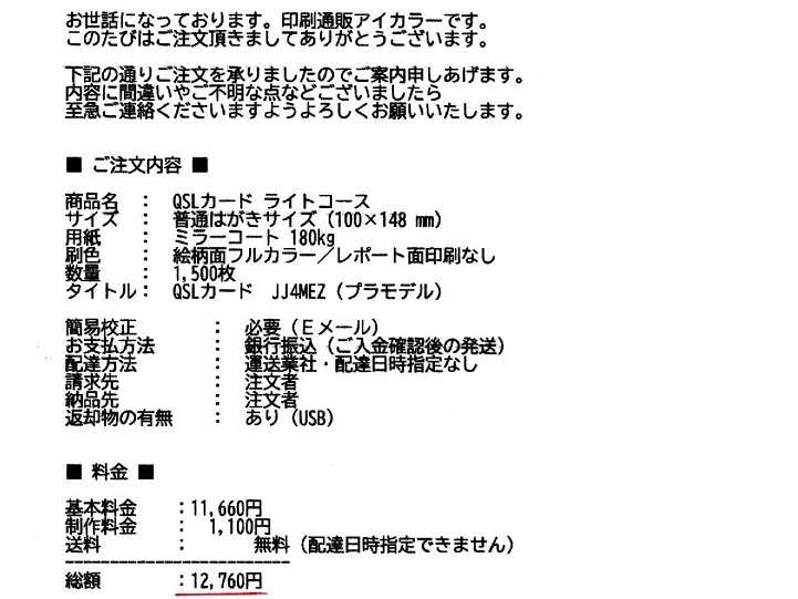 36種類目の新しいQSLカードをiColorに依頼しました。注文受けつけメールが届いたので代金はネットバンキングで振り込みしました。これまではオノウエ印刷に注文してましたが休止のためここに注文、オノウエ印刷より少し高く 8.5円/枚になります。