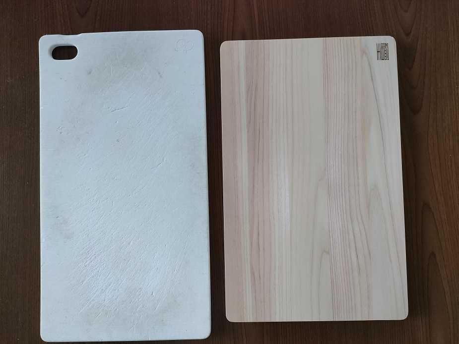 写真左側のプラスチック製まな板を使ってました。板が反ってきたのと包丁が刃こぼれの恐れがあるためamazonで2,592円の檜のまな板を購入しました。2,000円以下のまな板もありましたが製造国が不安で止めました。寿命はプラスチック製で6~7年、木製で2年だそうですが以前に使用してた木製まな板は10年以上使用してました。この販売店は商品を紙袋に送ってきたので養生包装してないので輸送配達中にキズが付く恐れがあります。
