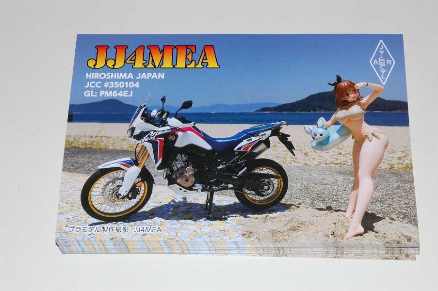 36種類目のQSLカードは今回初めてiColorに1,500枚注文。プラモデルとライザリン・シュタウトのフィギアをスマホで撮影しました。撮影後強風でBIKEが倒れ左側のハンドルが折れました。帰宅後接着剤で修理完了しましたが撮影前でなくて良かった。今夏より順次発行しJARLビューローのみでお届けします。只今発行中のカードはQRZ.comにも写真アップしました。YAESU FTX-1optima-50 注文予約が始まりました。20万円以上もしますのでカタログ見るだけです。