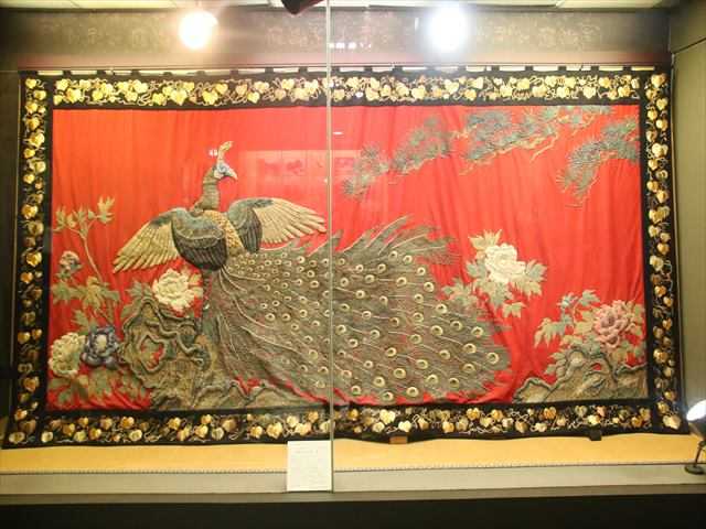 孔雀の雌雄をデザインした幕である。オランダ製の赤の羅紗地に金糸・銀系をふんだんに用いた