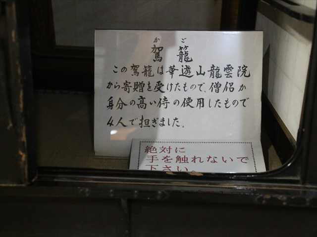 この駕籠は華遊山龍雲院から寄贈を受けたもので、僧侶か身分の高い侍の使用したもので4人