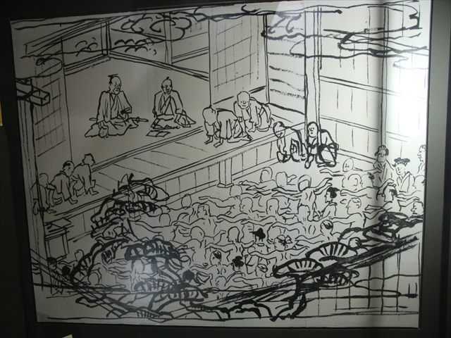 とりしまりました。この絵は、松前沖の口役所で、上陸したばかりの人たちがきびしい取調べを