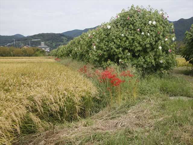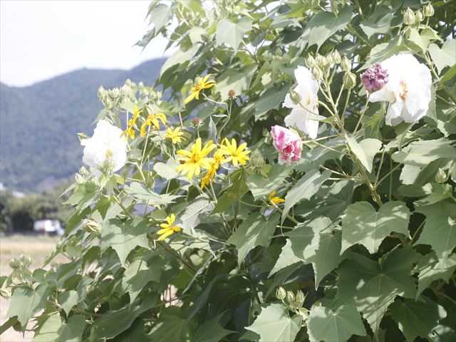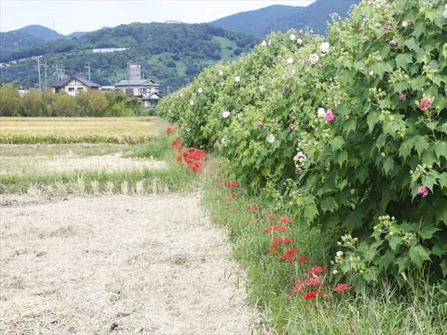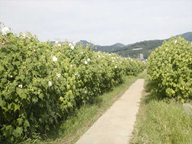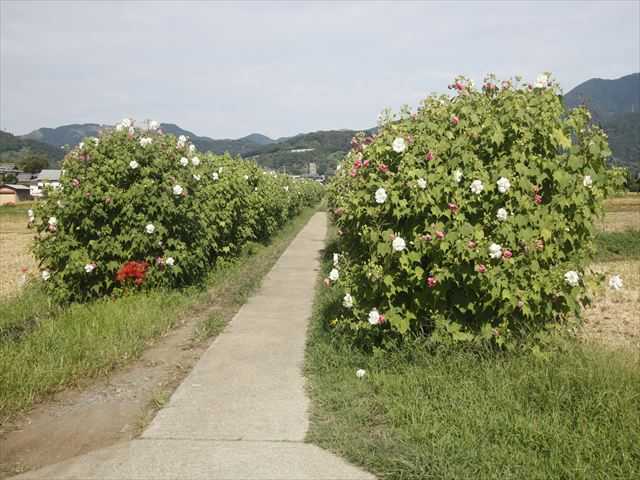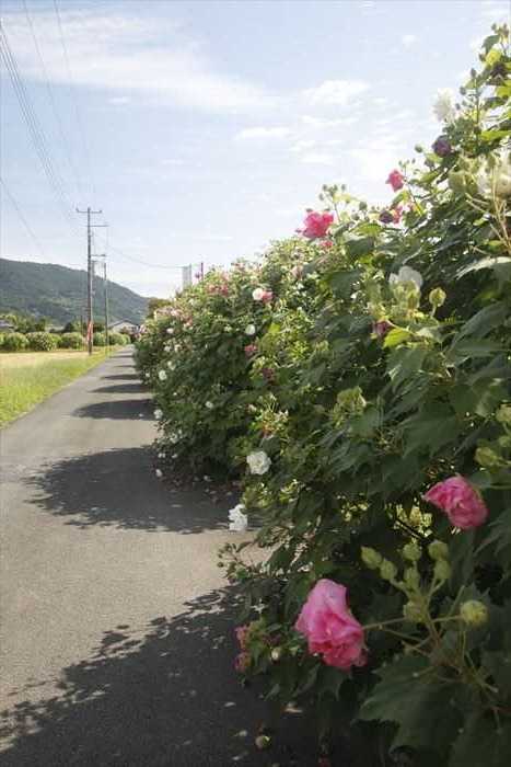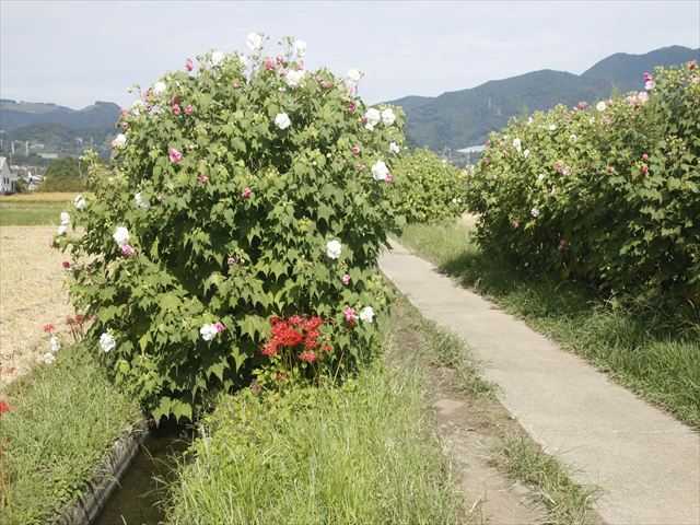 千津島ふくざわ公園脇の酔芙蓉農道(約1km)に大輪の花を咲かせ、例年9月中旬から見ごろ