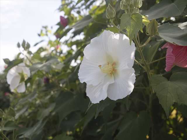 朝から夕方にかけて花びらの色が白から濃いピンクに変わる酔芙蓉700本と芙蓉100本が、