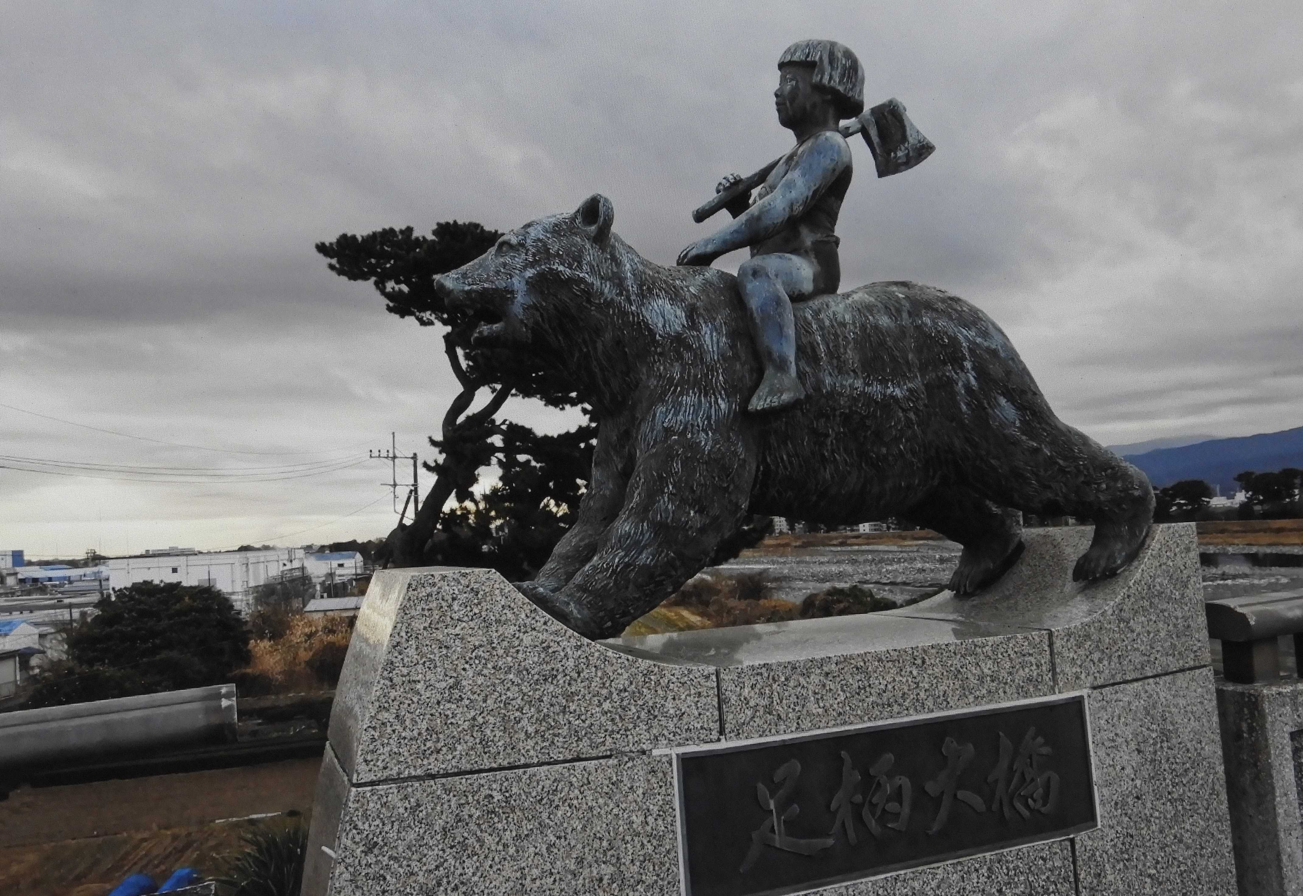 正面には、金時山、矢倉岳。足柄大橋の東側の欄干には熊に乗った金太郎像。