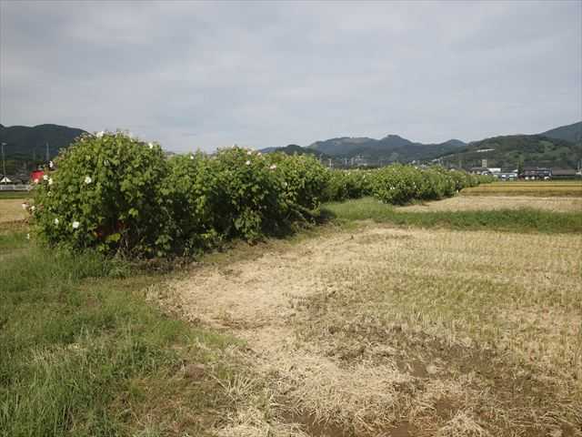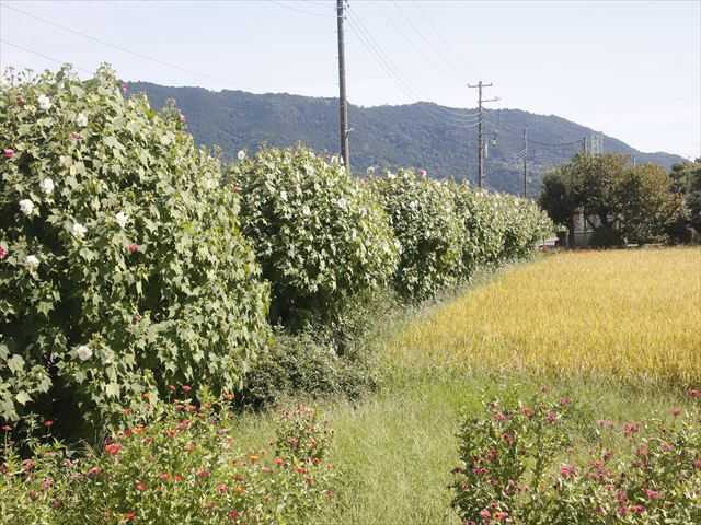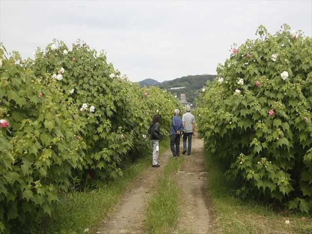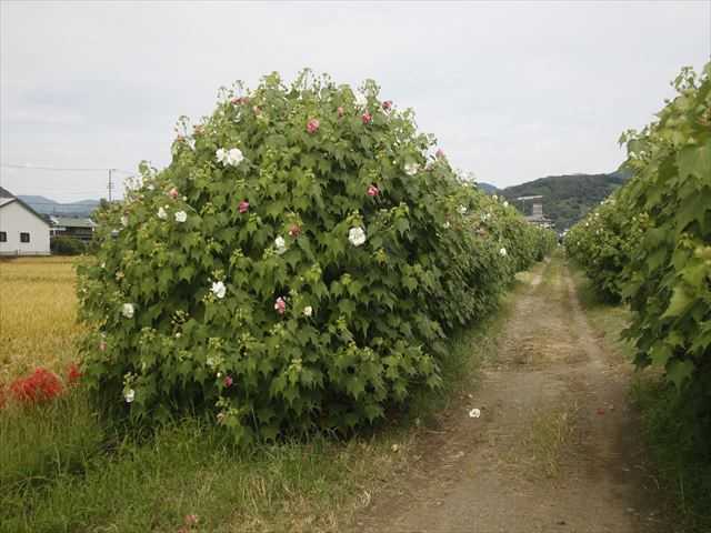 酔芙蓉農道は軽トラックが通れる幅で、酔芙蓉の背丈は2メートル以上ある。