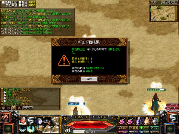 本日のGvは根性騎士団さんとの対戦です。過去6戦くらいやって1勝しかしてない強いギルド。最近は上昇気流なので勢いにのって勝ちたいとこです。Gvに参加できたBISは2人。構成は21人で3PT・・・BISなしが出来るなぁ・・・BISなしPTの人ごめんなさい;;支援がんばります。Gvの内容は逆転に次ぐ逆転のナイスゲーム!WIZ狙いの作戦かWIZ陣がとにかく狙われます。さすが根性さん・・・戦い方をわかっていらっしゃる・・・隙を見てリザをして、WIZ復活。なんとか前線を保てるようにがんばります。残り1分で9500 VS 8700くらいで劣勢。相手を取り逃がしてしまい、ダメか・・・と脳裏によぎりますがみんなあきらめません。一人一人しとめていき、あと一人で逆転ってところでギル戦終了。。。惜しかったと思ったらなんと「勝ちました」の文字。最後の数秒で仕留めて25点差の逆転勝利! 勝ち負け関係なく白熱した楽しい勝負でした。根性さんとは楽しいギルド戦ができるので今後も長くお付き合いしたいです^^みんなも楽しんでくれたようで組んだ僕もほんと大満足です。今後も楽しめるギル戦を組んで行くのでよろしくお願いします^^