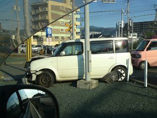 交通事故です。といっても私ではありません。今朝は7時半頃出社、昨晩作りかけだった書類を完成させ、朝一番に取引先へ届ける途中、8時頃だったと思いますが、某橋を渡ると上の写真のように小型車が縁石を超えてポールに突っ込んでいました。ちょうど真横で信号が赤に、思わずパチリと写真とってしまいました。朝のラッシュ時なのでそんなにスピード出せないと思うんですが・・・。 皆さん、運転には充分気をつけましょう!