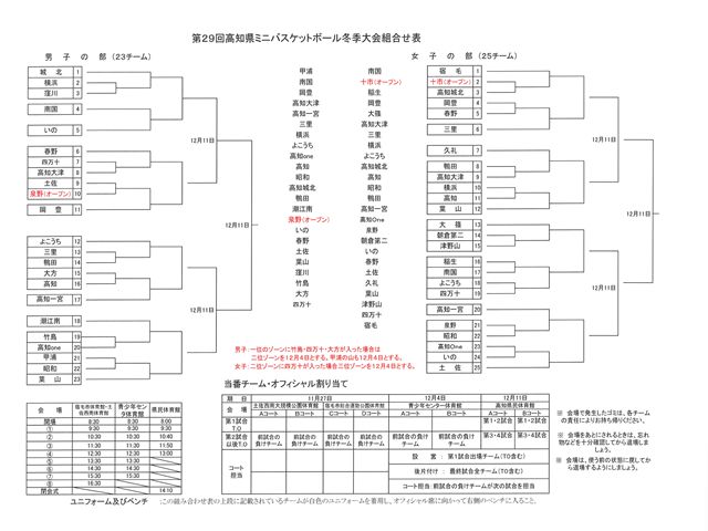 土曜日にミニバス冬季大会の抽選会があり、対戦相手が決まりました。まだ会場とか当日の予定なんかは未定ですが下の表のようになりました。チーム名に関しては普段は大津以外は頭文字をアルファベットにしていますが、組合せ表なんかは連盟のHPに公開されているので今回はそのまま掲載します。字が小さくて見づらいという方はここを見て下さい。本年度最後の公式大会なので、何が何でも勝つぞ!という気持ちを持って!頑張れ!高知大津MBC