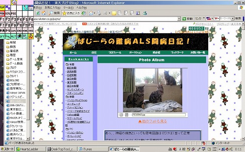 「アクアゾーン」てソフトがあります。バーチャルで熱帯魚を飼うソフトですが(昔本物を飼ってた)、これの体験版てのがあって・・・http://www.aztv.gr.jp/azve/play/play.htmlダウンロードして、こいつを立ち上げると「HeartyLadder」の操作パネルがフラッシュを始めて、ほぼ操作不能になります。「HeartyLadder」作者の吉村氏に問い合わせたところ、理由はわかっていて、、、しかも解消が不能なんですねぇ。うーーん残念無念o( _ _ )o ショボーンバーチャルでもグッピーやネオンテトラを飼えるっ!と・・・・ヾ(●⌒∇⌒●)ノ わーい・・・が・・・ ( ̄▽ ̄;)!!ガーン・・・に・・(T_T)