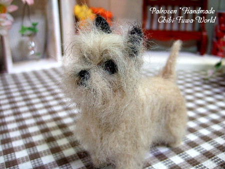 K様ご依頼の3体目が完成しました(*⌒-⌒*) ケアンテリア(ウィートン)のPHILIPちゃんです。サイズ (約)高さ11×体長11cm 素材 ウール その他 グラスアイ(ブラウン)もしゃもしゃの毛がたまらなく好きです(≧w≦)/ 今回はウィートンカラーということで黄色が入った羊毛(茶の差し毛入り)、ベージュ、グレーを混ぜて作ってます。 “耳は黒く”とのご依頼でしたのでちょっと黒いです。ブリンドルのKAIちゃんより1センチ大きくなってしまいました~ 1センチ違ってもこんなに違って見えるんですよね(^o^;ヾ