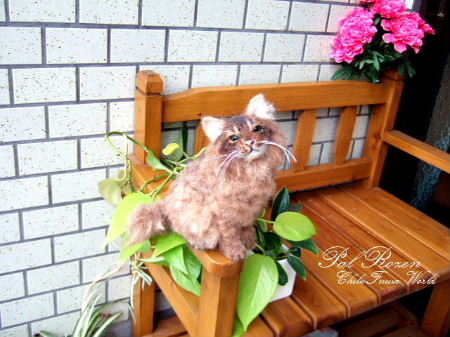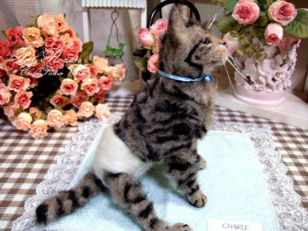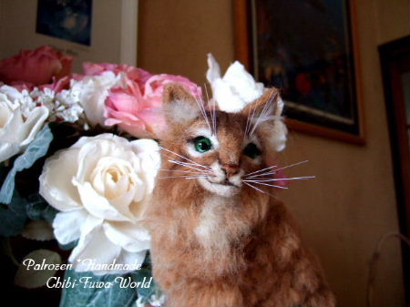 先日、猫ちゃんをオーダー頂きました。猫ちゃんの名前は官九郎君。オスのキジ猫です。画像を拝見してみてビックリ!なんと官九郎君は、オムツをつけていました。 そう、下半身不随なのです。障害を持ったペットを育てていくのは簡単ではありませんね。飼い主さまの深い愛情と介抱があってこそ、元気でいられます。 官九郎君も普通の猫のようにとっても元気で暮らせるのも、 ひとえに飼い主・M様の愛情があってこそですね(^^) オーダーのご要望のひとつとして、“オムツ”も再現してほしいとのことでした。縫い物が出来ないわたしはオムツも羊毛で作ることにしました。いや、難しかったですけど、優しいオーナー様は誉めてくださいました(感謝です)至らない点も多いと思いますが、オーナー様が喜んで下さるとわたしもすごく嬉しいです。官九郎君、フリース・官九郎君とご対面で、ふんがふんがニオイを嗅いでいました(^^)これからもう~んと長生きしてほしいと願いを込めてお作りしました。