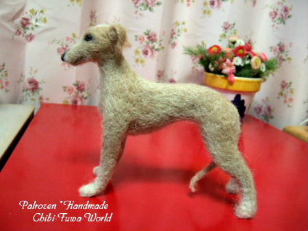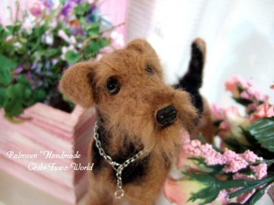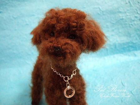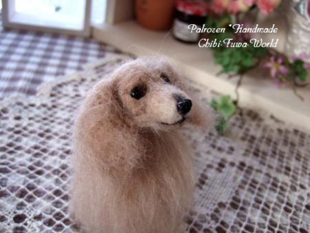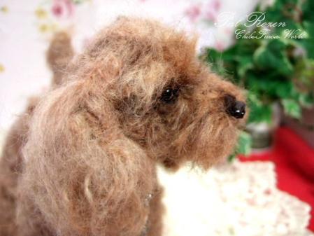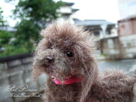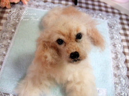 Iさまご依頼のトイプードル・姫ちゃんのフリースドッグです。サイズは頭まで約16cm。姫ちゃんは独特のカットをしてるので、写真とにらめっこ。 カラーも今までに見たことないカラーでしたので、羊毛を染色してみました(^^)少しでも実物に近づけるように、試行錯誤しながら制作しましたよ~ドアップ(^^;)台風一過で、すがすがしい中、外に出て撮影しました。ポーズは、オーナーさまのご希望で、 ちょっと上目遣いの「まだこないかな~」って顔の姫ちゃんを再現。 オーナー様のお宅には姫ちゃんの他にも5頭のプードルちゃんがいるんですよ。うらやましいですね~わんこが飼えないわたしはため息が出ます@~(´∀`*)実は姫ちゃんのあと(他の5頭の)5体のオーダーのご依頼がありました。早く全員そろった姿をお見せしたいのですが、制作は来年になります(^o^;ゞオーナー様、ごめんなさい~首を長くして待ってて下さいませ~★姫ちゃん他、プードルズのブログはコチラ可愛いプードルズにたくさん会えますよ(*⌒-⌒*)