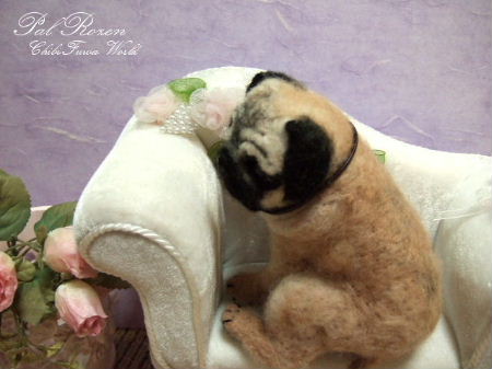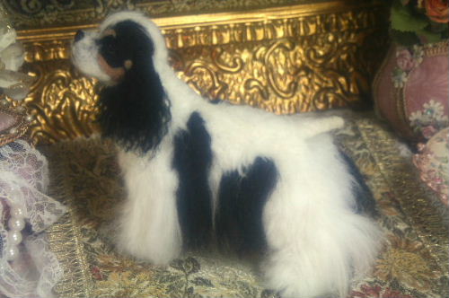 アメリカン・コッカースパニエルのチャコちゃんです(^^)この仔も約20cmの大きなサイズ。羊毛フェルトっていえば10cm以下の小さなお人形を思い浮かべますが、Pal Rozenの作るフリースペットは、だんだん大きくなっていってます(笑)リアルに作りたい一心で作ってたらどうしても大きくなってしまうんですよね。20cmクラスになりますと、10cmの約3倍以上の羊毛と労力がかかりますので、制作時間もその分長くなるのが難点です。でも、おかげさまで大サイズのご注文も多くなりました(^^)今回オーダーご依頼いただきましたA様は海外在住の方です。日本にいるお母様のお加減が悪く、担当医様から出来るだけお母様の好きだった物を身の回りに置いて欲しいと言われたことで、実物に近いコッカーのお人形をご依頼されたのです。お母様が早く良くなることをお祈りしながら制作させていただきました。