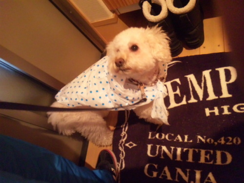 散歩に行こうと思ってドアを開けたら雨 降っとって 地面が濡れとった 基本 裸族の うちのわんこ( 服を着せようとすると 狂犬になるんで )ですが ・ ・ ・ 急遽レインコートを お葬式かなんかで 果物を包んであったビニール袋の泥棒 しかも帰って 足を拭く時 すんげぇ~ ガウガウ