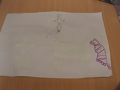 イタリアの教会で出会ったキリスト像は、ぱなっちの心に深く刻み込まれたようで、今でもときどき会話に出てきます。そして、バービーでキリスト像を作ったりもしているぱなっちです。そのぱなっちの新作。水色の紙に水色の切り絵を貼り付けているので、よく見えませんが、上に磔にされているキリスト像、その下は祭壇。左にお墓です。キリストは足を重ねて杭を打ち込まれています。『禁じられた遊び』ですねこの場に、場違いな猫像が描きこまれています。すごく良く画けているのですが、場違い度に笑ってしまいました。そして、これは大好きなジョージァへのお誕生日カード(習作)。左から、バルーン、ケーキ、カード。ケーキとカードはテーブルに飾られています。10歳の誕生日だそうです。