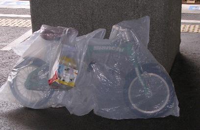 なぜか。MTB時代には輪行はやらなくて自動車派だったけど。 小径車のビアンキになってから、(単身赴任したからとも言うが)輪行をするようになったなー。都会に来ると、電車の移動がメインになったら、輪行やな。って感じです。 写真は、ゴミ袋に入って輪行してる写真です。(半透明がオシャレでしょ。)***オシャレ自転車 ****
