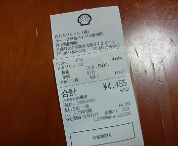 値下げをしてから初めてガソリンを買いました。ハイオクで133円です。 岡山のバイパスだと値段競争してるから岡山では一番安いかな。 早速、GOGO GSに登録しておきました。まあ、また値段が上がるかもしれないので満タンにしときました。 値段は安定させて欲しいですね。添加剤でも紹介しときましょ。高性能添加剤! アウグ パワーガソリン235ml C-17