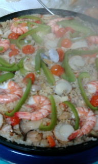 美味しく、楽しいパーティーメニュー!みんなで、持ち寄ったものや、冷蔵庫にある野菜などをつかって、栄養たっぷりの『パエリア』をつくってみませんか?お手軽簡単!集まった皆でつくれば、楽しさも美味しさもアップすることでしょうホットプレートでつくるパエリア材料(6~7人分)--------------------・米 5合・たまねぎ 中1個・にんにく 2片・ミニトマト 人数分・海老(お好みの種類を) 人数分または人数分×2くらい・あさり 400g・鶏肉(お好きな部位を) 200g・ピーマン(色はご自由に~) 2個・野菜の角切り(お好みで※1 の下ごしらえをする)・シーフード(好みで、※2 参照)◎白ワイン 200 cc◎水 600 cc◎ブイヨン(固形スープの素2個でOK)◎塩 小さじ1◎サフラン 小さじ1/2 くらい--------------------つくりかた1.お米は軽く洗ってザルに上げておきます。たまねぎ、にんにくをみじん切りにします。鶏肉はお好みの大きさに切ります。一口大がおすすめ。あさりは、砂抜きし、洗います。※1=野菜は、それぞれ1センチ角に切ります。ニンジンなどの火の通りにくいものは、軽く電子レンジで火を通し、煮えやすくします。※2=切り身の魚や、イカ、タコなど、色々お好みで用意しても楽しいです。簡単に、冷凍のシーフードミックスをつかってもいいですよ。◎の材料は、鍋にすべて入れて、あたためておきます。--2.ホットプレートを180~200℃にあたためあます。オリーブオイル(バターでもOK)油少々(材料外)で玉ねぎとニンニクを、よく炒めます。透明になってきたら、鶏肉を加えて炒めます。鶏肉の表面に火が入って色が変わったら、お米を加えて、まぜながら5分程度炒めます。--3.◎のスープを流しこみます。全体にまんべんなく、行き届くようにまぜて、5分ほど煮たたせます。ここで!材料の追加が来ましたエリンギ と、 ホタテです・・。エリンギは、スライスし、ホタテは、そのまま、後ほど海老と一緒に使います。ここで、1センチ角の野菜をいれます。4.あさり、海老を並べて入れます。☆追加のシーフードなどは、ここで加えていきます。火を通し過ぎるともったいない具材は、時間差をつけて入れます。フタをして、160℃にして6分煮ます。そのあと、エリンギ、ピーマン、ミニトマトを飾り、フタをして、110℃にして17分加熱します。5.4の加熱後、保温のところまで温度を下げ、6~12分くらい蒸らします。好みで、パセリをふりかけても香りがいいです。(材料外)できあがり!保温のまま、おとりわけして、いただきま~すポイント!・スープとお米が、まんべんなく、しっかり混ざるようにしましょう。・柔らかめ、固めなど、お米の炊きかたの好みによって、水かげんを調整するといいですね。・今回は、妊婦さんも食べられるように、仕込みのスープにサフランをれていないもので写真をとりました。サフランの詳細について、妊婦さんは食さないようにしたほうが良いといわれています。その場合、香りと色づけに、ターメリックを使う方法もあります。・ホットプレートによって、様々な癖や特徴があるので、様子をみながら進めてみてくださいね。