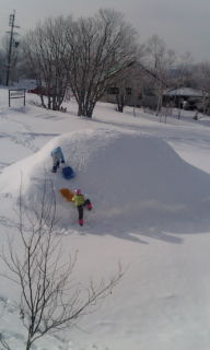 こんにちは。スキーこどもの日!なので、今日は何と!お子様のリフト一日券が、無料の日。でございました。ゲレンデよりも、こっちが楽しい!?よじ登っては、ズズズ--っと滑走お子様たち、とっても楽しそう!大騒ぎの、はしゃぎ声がして、いったい何人のお子様が??と思って見てみたら、お二人でした。このあと、人が増えて、大人たちも本気で雪遊び・・。あ・・その写真を、とり忘れ・・。このあと、これって・・かまくらへと発展するのでしょうか?それとも、今年は雪像と、雪山でシーズン終了までいくのかしら。楽しみです・・。Kayoko Tajima